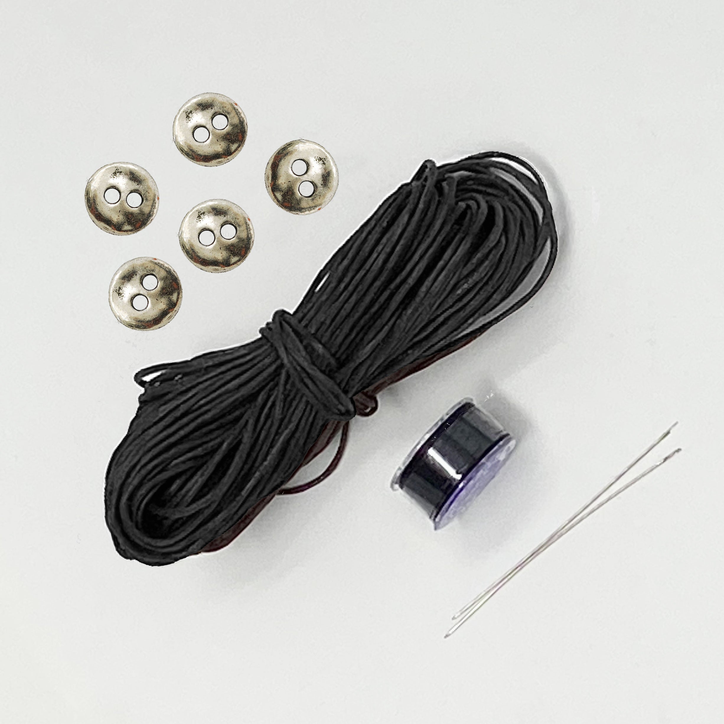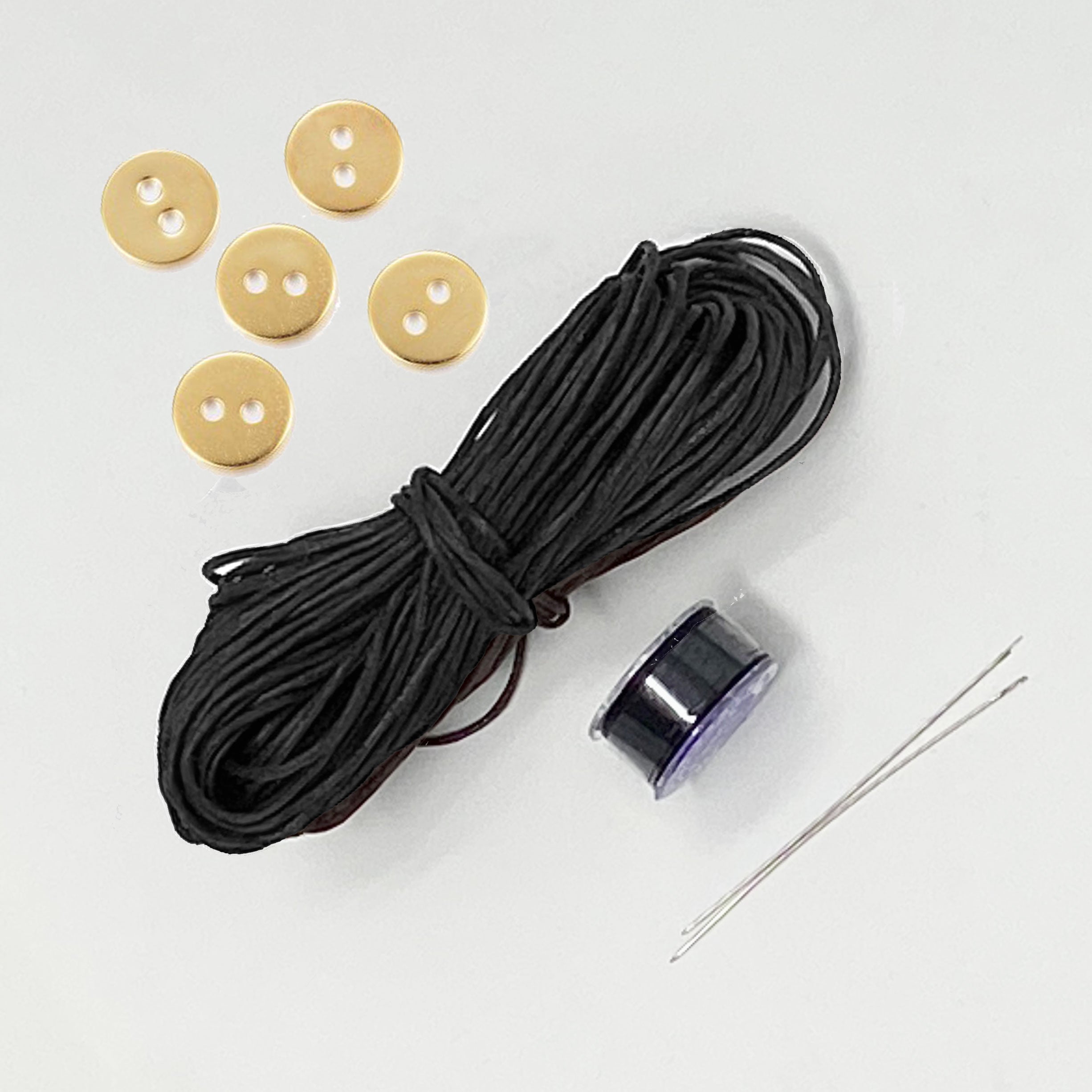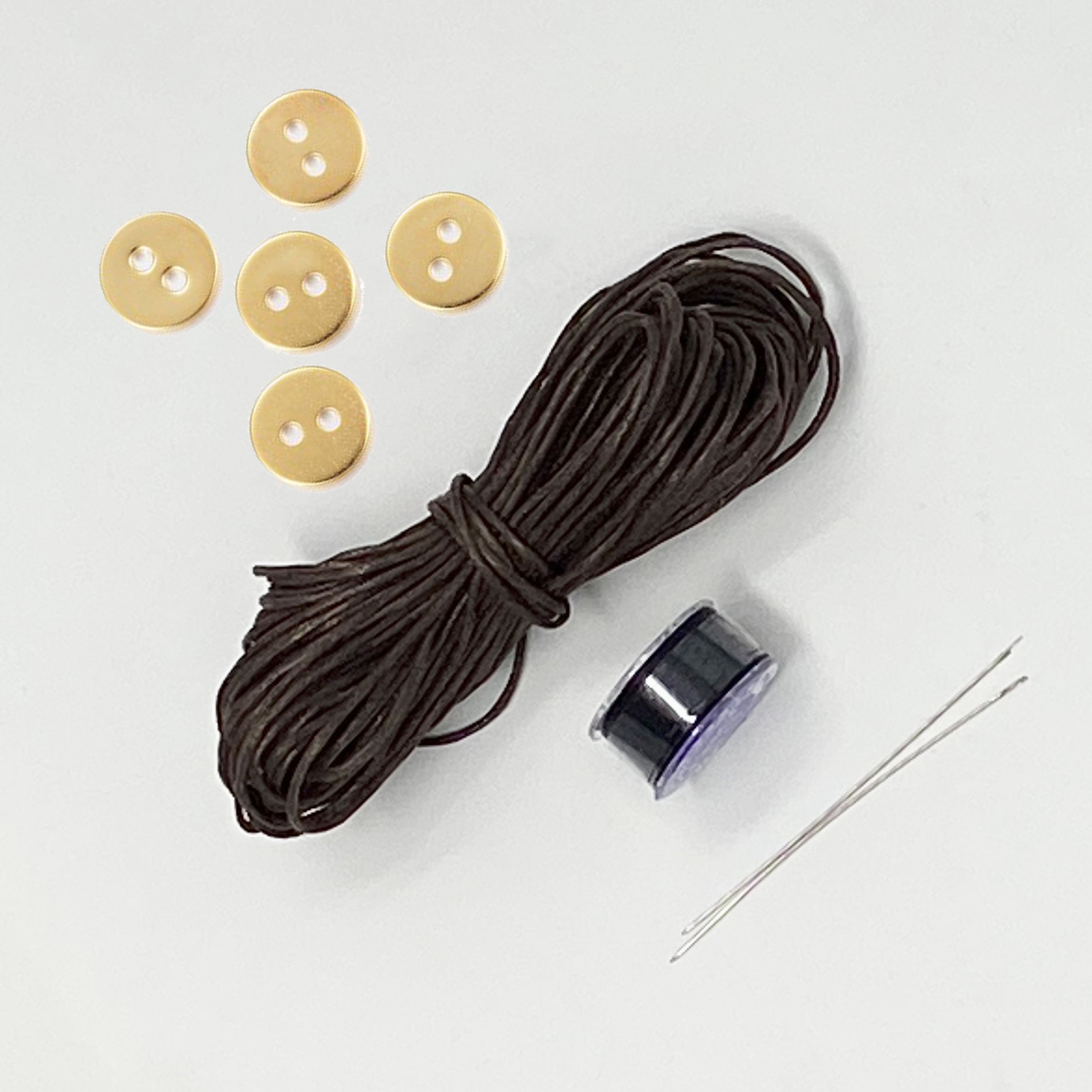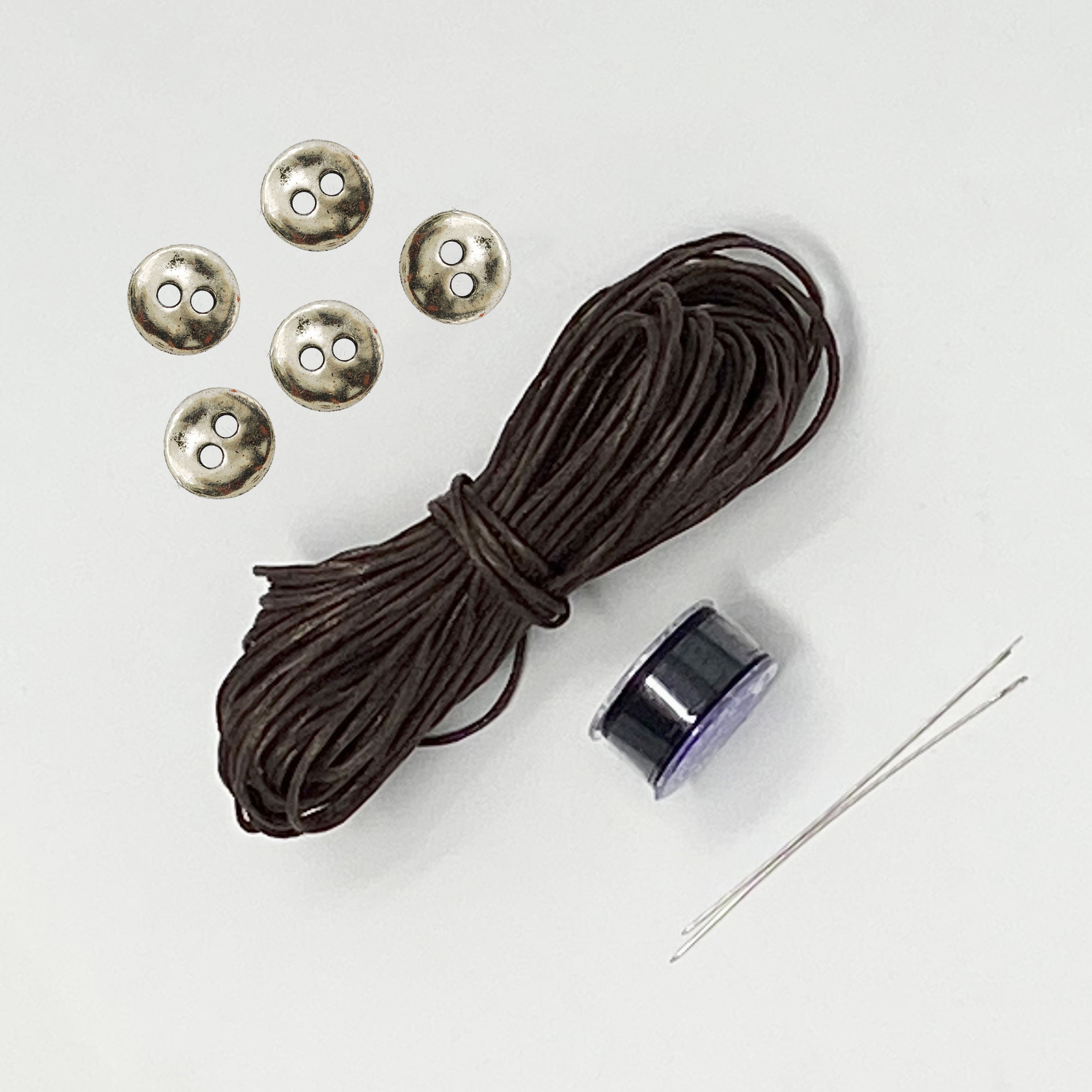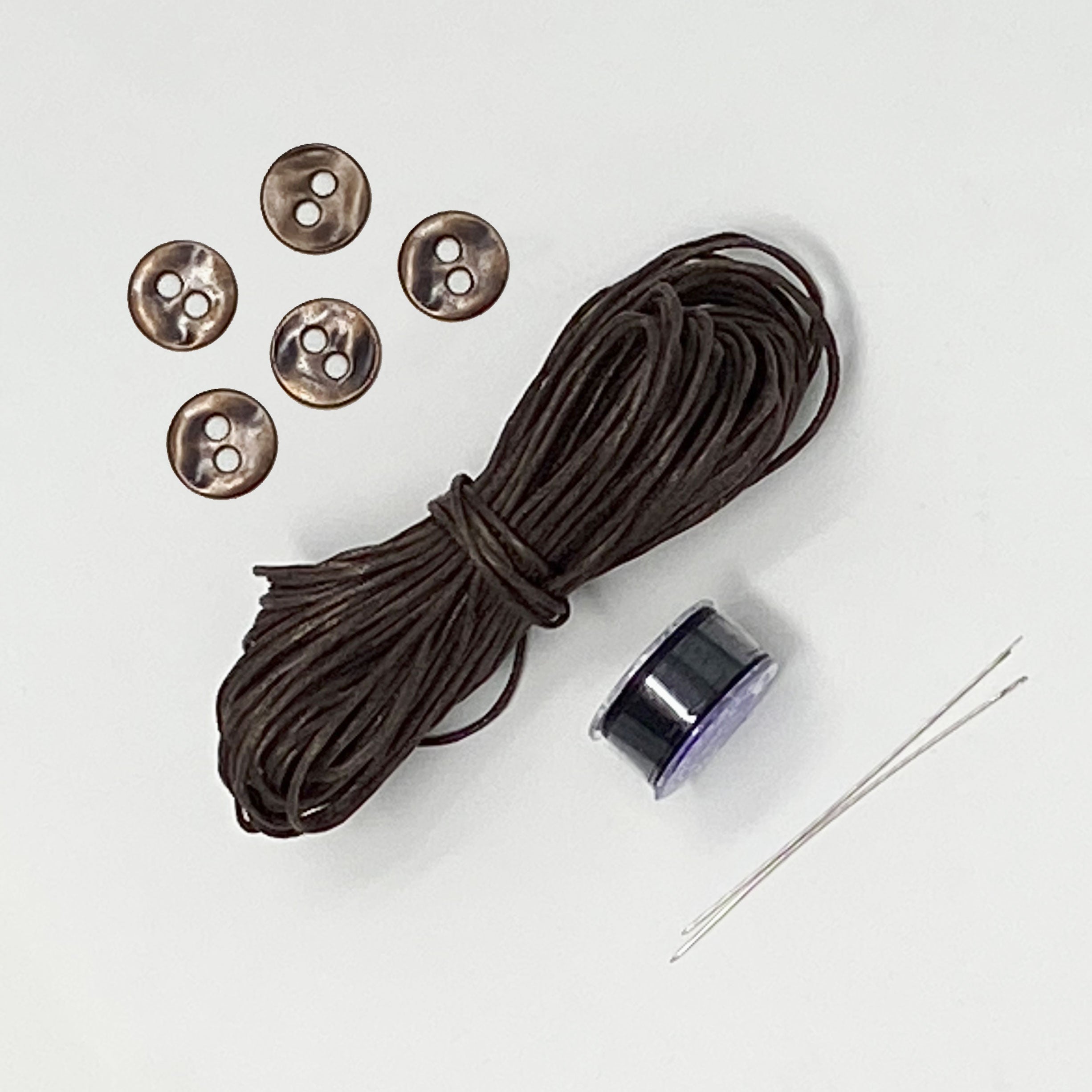 Includes: 1 spool (approx. 50 yds) of Japanese beading thread, 10 yards of 1mm waxed cotton cord, 5 buttons and 2 beading needles. Choose between copper or silver alloy, or gold stainless steel buttons