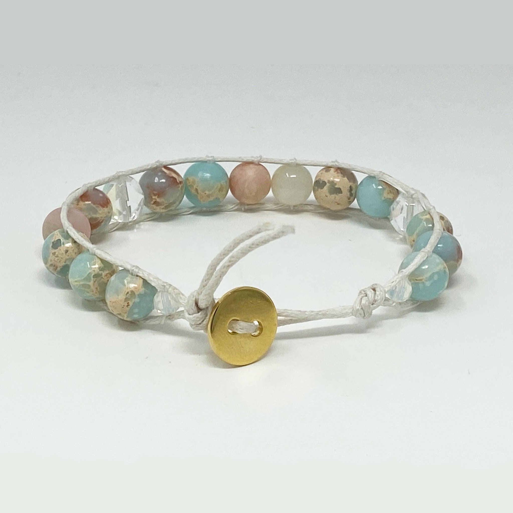 What's Included? 8mm natural beads - natural jasper, pink opal, moonstone and czech glass. 2ft. white waxed cotton cord, white nylon beading thread (2x what is needed in case of mistakes), a button, a needle, and DIY bracelet instructions. All packaged in a cute little tin!